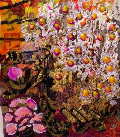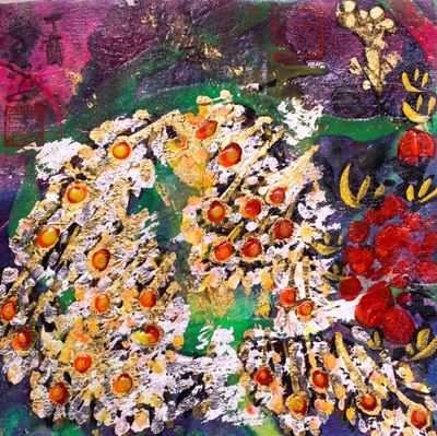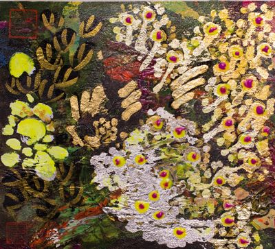 Mixed media on Dong Ba paper. 24k gold, 18k gold, silver; Fluorescent and glow under UV light; medium; 17 cm x 20 cm (painting without frame)